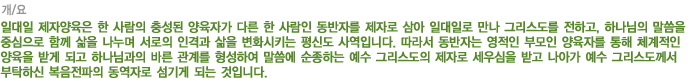 ÀÏ´ëÀÏ Á¦ÀÚ¾çÀ°Àº »õ·Î µî·ÏÇÑ ½ÅÀÚµéÀÌ Ã¼°èÀûÀÎ ¾çÀ°À» ÅëÇØ ¸»¾¸¿¡ ¼øÁ¾ÇÏ´Â ¿¹¼ö ±×¸®½ºµµÀÇ Á¦ÀÚ·Î ¼¼¿öÁö°í, ¼¼¿öÁø »ç¶÷ÀÌ ¶Ç ´Ù¸¥ ÇÑ »ç¶÷À» Çϳª´ÔÀÇ »ç¶ûÀ¸·Î ¾çÀ°ÇÏ¸ç ¼¶±æ ¼ö Àֱ⸦ ¿øÇÕ´Ï´Ù. ÈÆ·ÃµÈ ¾çÀ°ÀÚ°¡ µ¿¹ÝÀÚ¸¦ ÀÏ´ëÀÏ·Î ¸¸³ª ¸»¾¸À» Áß½ÉÀ¸·Î »îÀ» ³ª´©°í ¼·Î ¼¶±â¸ç, °Ý·ÁÇϰí, µµÀü ¹Þ°í, ±âµµÇÏ´Â °¡¿îµ¥ Çϳª´ÔÀÇ ÀÓÀç¿Í ¿ª»ç¸¦ üÇèÇÏ°í ¿ÂÀüÇÑ ±×¸®½ºµµÀÇ Á¦ÀÚ¿Í Çϳª´ÔÀÇ ÀϲÛÀ¸·Î ¼¼¿öÁö´Â °ÍÀÔ´Ï´Ù. Çϳª´ÔÀÌ ¿ì¸®¸¦ ÀÏ´ëÀÏ·Î ¸¸³ª ÁÖ½Ã°í »ç¶ûÇØ ÁÖ½Ãµí ¿ì¸®µµ ÁÖ´ÔÀ» Àß ¸ð¸£´Â ÇÑ »ç¶÷ÀÇ ¿µÀû ºÎ¸ð°¡ µÇ¾î ¼¶±â¸ç ÇÔ²² ±â»Ý°ú ½½ÇÄÀ» ³ª´®À¸·Î½á Çϳª´ÔÀÇ »ç¶ûÀ» ÀÌ ¶¥¿¡ ½ÇõÇϰíÀÚ ÇÏ´Â °ÍÀÔ´Ï´Ù. |